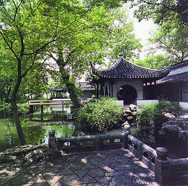 拙政園始建于明正德四年(公元1509年)。它雖經(jīng)過(guò)幾百年的蒼桑變遷,但這里處處山水明秀,廳榭典雅,花木繁茂,漫步在其中,你仍能感受到其平淡疏朗、曠遠(yuǎn)明瑟的明代氣息,游過(guò)全園,給我印象最深的是位于中部花園的最東面的"梧竹幽居",這里造型非常別致,四個(gè)大大的圓洞門使人馬上聯(lián)想起八月十五晚上的月亮。而更神奇的是如果你站在亭子里向外看,這四個(gè)圓洞門又恰似四個(gè)巨大的鏡框,鑲嵌著蘇州園林一年四季的風(fēng)光。